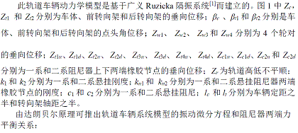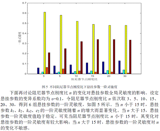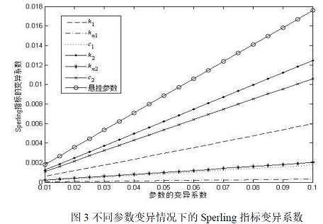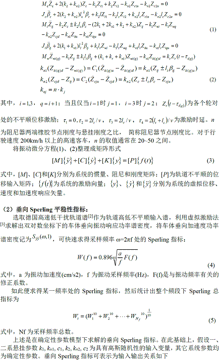 成果特色:建立了轨道车辆动力学模型,并以此为研究对象利用虚拟激励法求解垂向平稳性指标,建立平稳性指标与悬挂参数之间的函数关系,即建立目标函数,之后利用Lain超立方抽样法分析了悬挂参数不确定性对平稳指标的影响。本文还在不同阻尼器节点刚度比的情况下,利用全局灵敏度分析法研究了平稳性指标关于悬挂参数的一阶灵敏度和总灵敏度。